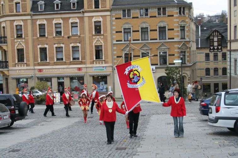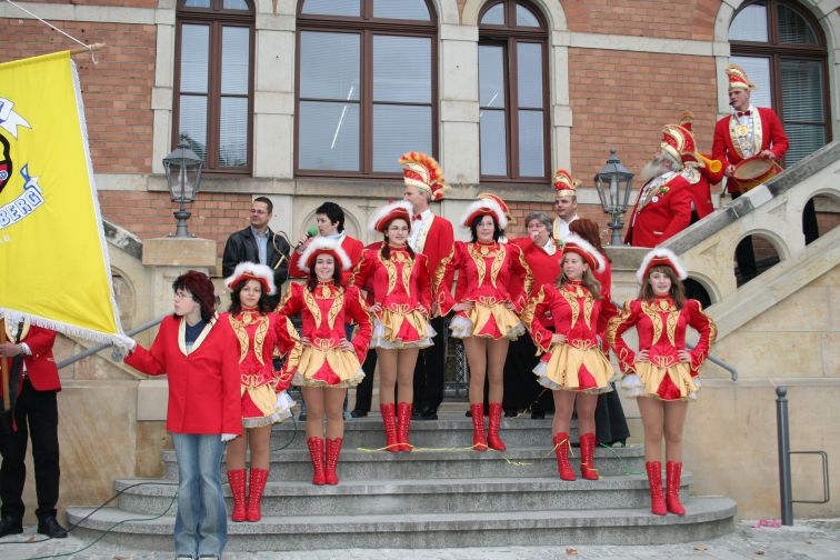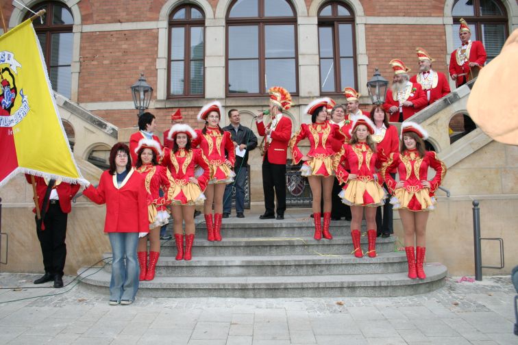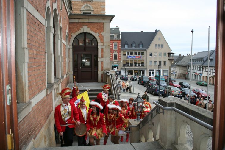 Am 11.11., Punkt 11.11 Uhr ging die Amtsgewalt von Bürgermeister Marcel Schmidt traditionsgemäß an die Narren der Carnevals-Vereinigung Stollberg (CVS) über. Etliche Schaulustige hatten sich am Markt eingefunden, als die Prinzengarde mit Fahne und Musik wie alle Herbste wieder das Rathaus „besetzte”.