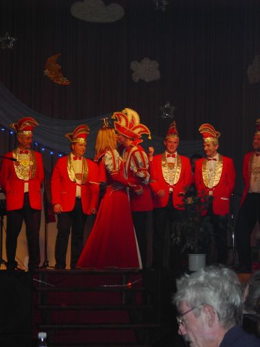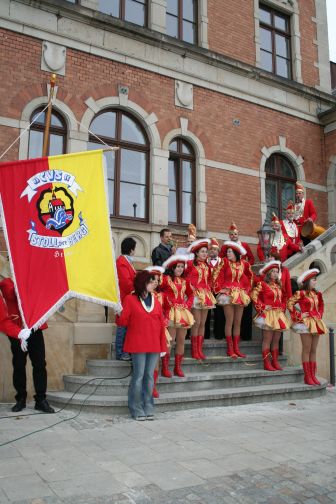 Bevor er aber den Schlüssel übergab, wollte das Stadtoberhaupt als Gegenleistung geküsst werden. Dass sich die feschen Funkenmariechen allesamt zierten, mag daran gelegen haben, dass Frau Schmidt mit dem jüngsten Nachwuchs Lisa in der Nähe weilte. So musste eine gestandene Närrin das Kuss-Siegel aufdrücken. Der Bürgermeister nahm’s gelassen und verkündete, dass nun die Zeit des Grinsens begonnen habe. Um sein Haus nach der fünften Jahreszeit aber wieder zu erkennen, verweigerte er den holden Narren den Zutritt zur Kämmerei. Die Faschingsschar quittierte diesen Trotz mit der Feststellung, dass dort sowieso nichts zu holen sei.