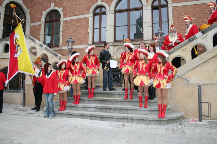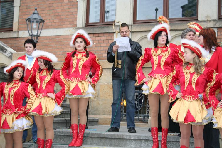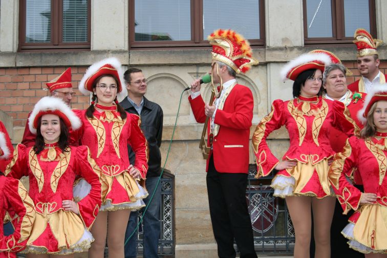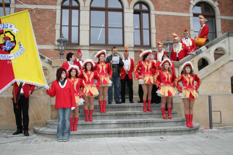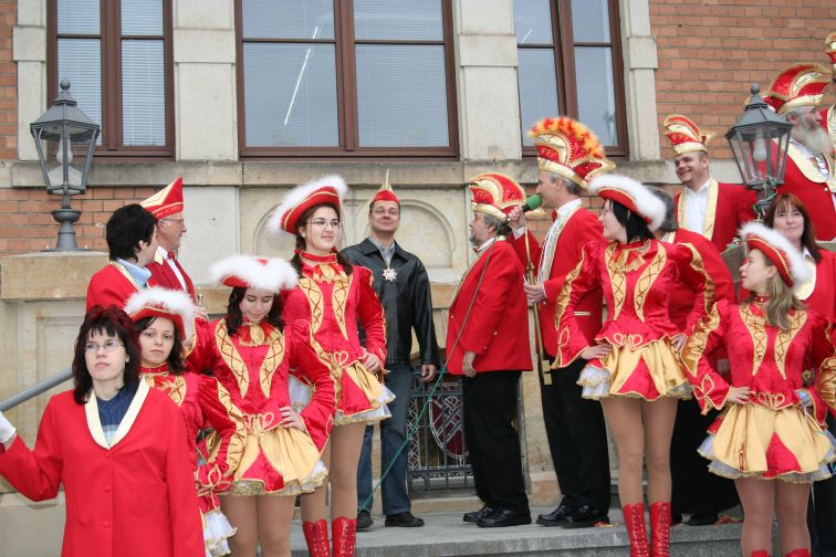„Wir wollen etwas Narretei ins Rathaus bringen und die Ordnung, die dort herrscht, gehörig durcheinander Würfeln. So kann es ja nicht weitergehen!” ließ der Präsident der kreisstädtischen Karnevalisten Dirk Bretschneider am Rande der Attacke verlautbaren. Nachdem der Hornist in sein Instrument gestoßen hatte, rückte Bürgermeister Marcel Schmidt freiwillig und ohne Gegenwehr den Amtsschlüssel heraus. Er verband diese Handlung freilich mit den Worten: „Wie jedes Jahr um diese Zeit, steh’n wir auch heute hier bereit, um allen Leuten laut zu sagen: Jetzt braucht Ihr endlich nicht mehr klagen. Im Rathaus kriegen alle frei, ab heute herrscht die Narretei!”